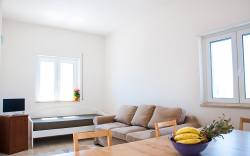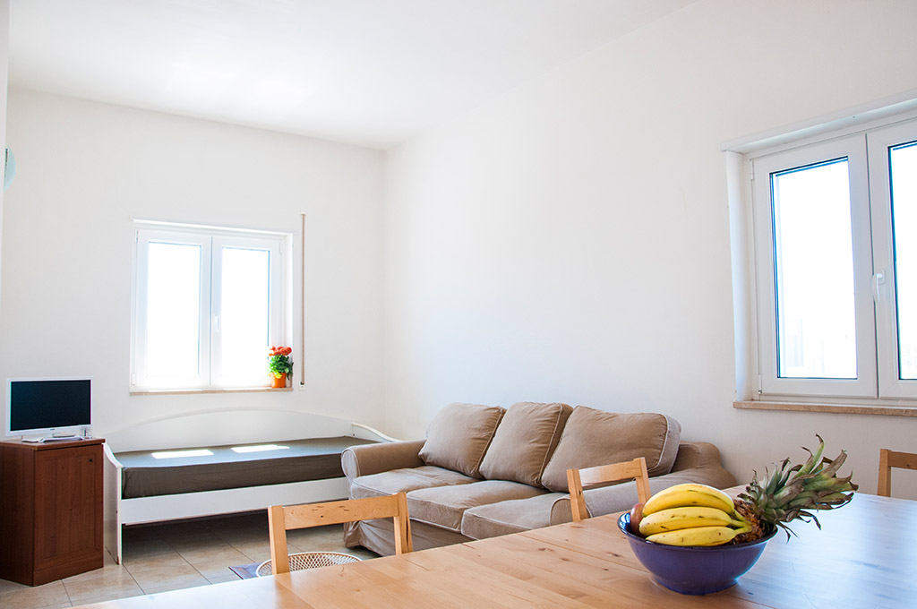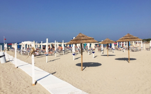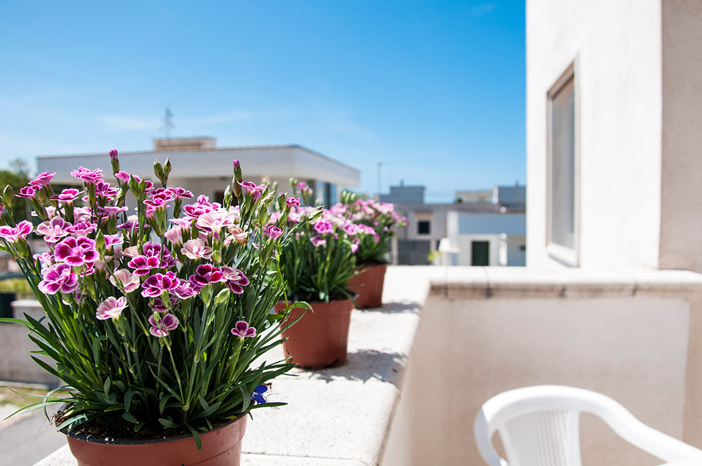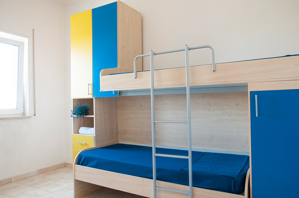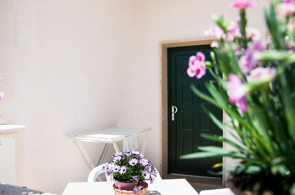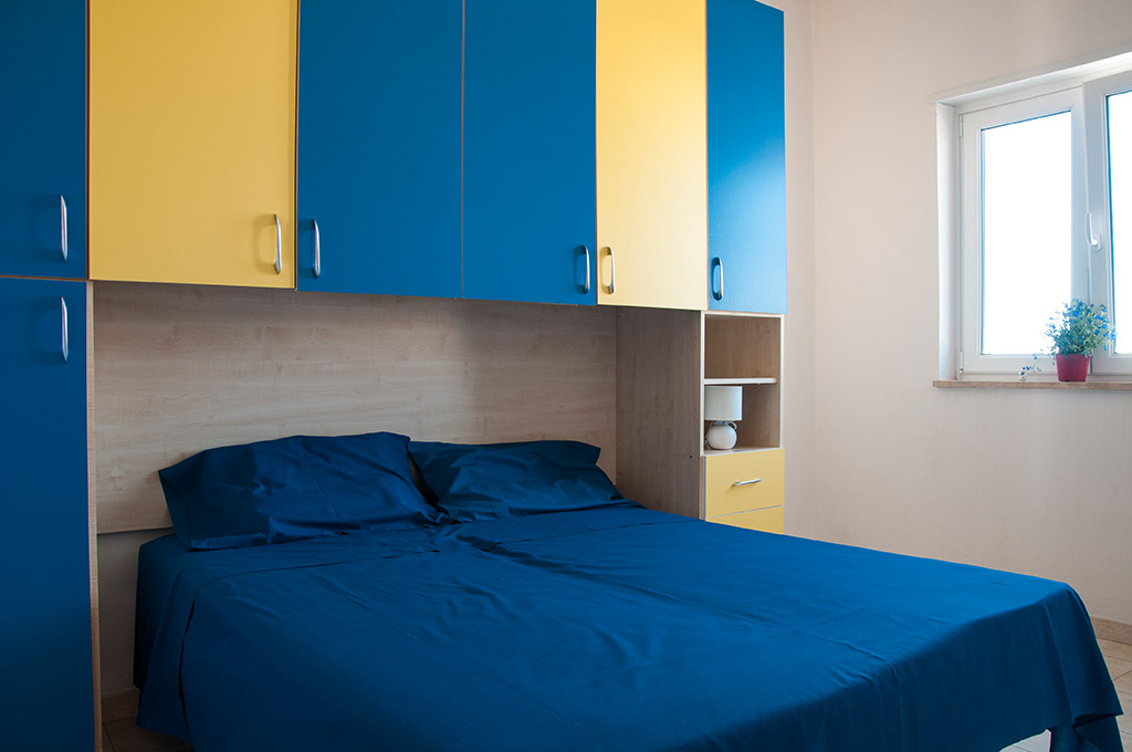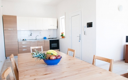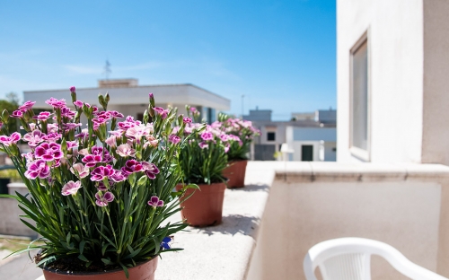 Terraced villas on the coastal strip of Carovigno (BR), in Pantanagianni, a seaside resort between the protected natural Oasis of Torre Guaceto and the "Costa Merlata" of Ostuni. In a private residence, comfortable houses 200 m from the sea - blue flag awarded by FEE (Foundation for Environmental Education). The villas are on the first floor with independent access and consist of three rooms of approx.70 m2 plus utilities. There is a living room with sofa/bed, fitted kitchen, small hall, bathroom with shower, double bedroom, bedroom with two single beds. The villa can accommodate up to a maximum of seven beds. Spacious equipped veranda. Private enclosed access from external ground floor area with parking spaces and shower. Included: split air conditioning in living room, TV and washing machine. Suitability: Babies admitted (cot and high chair included), animals admitted.