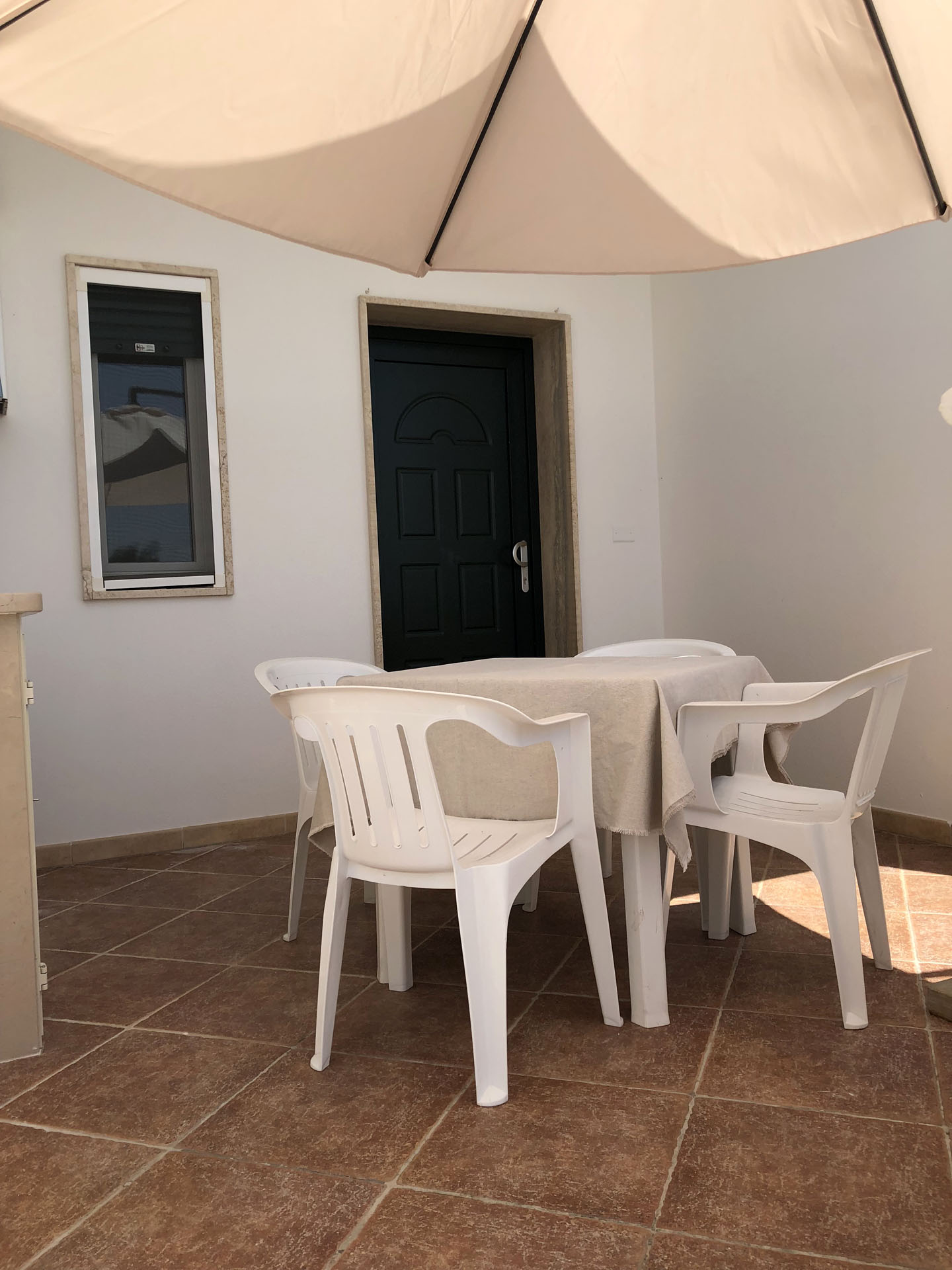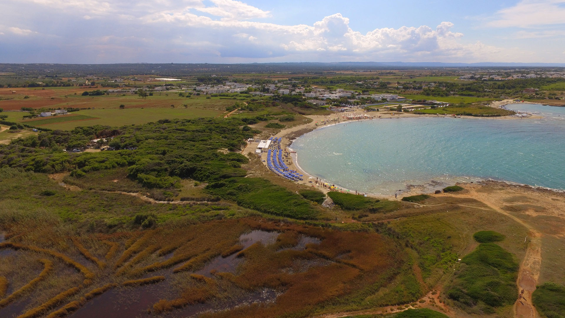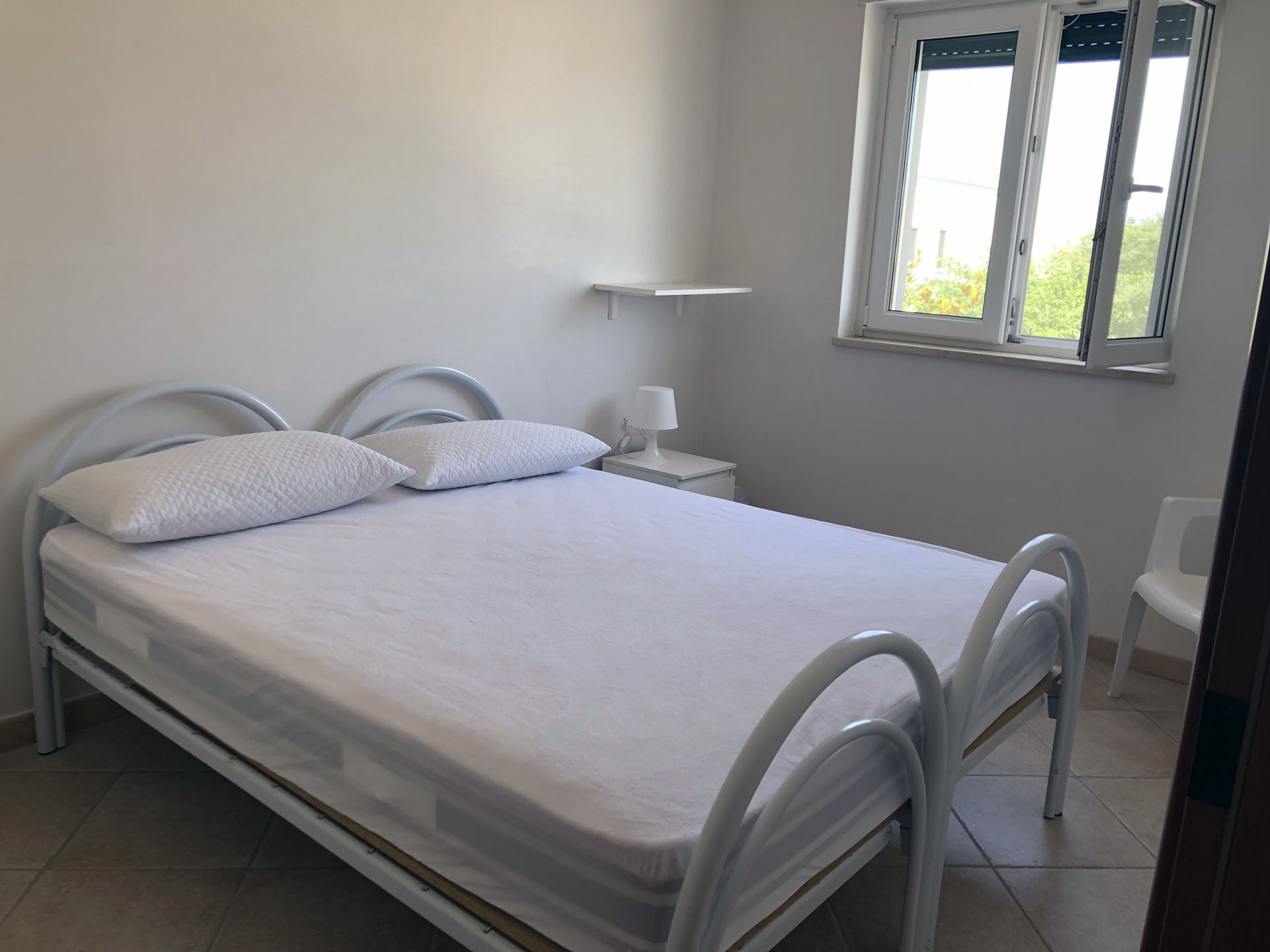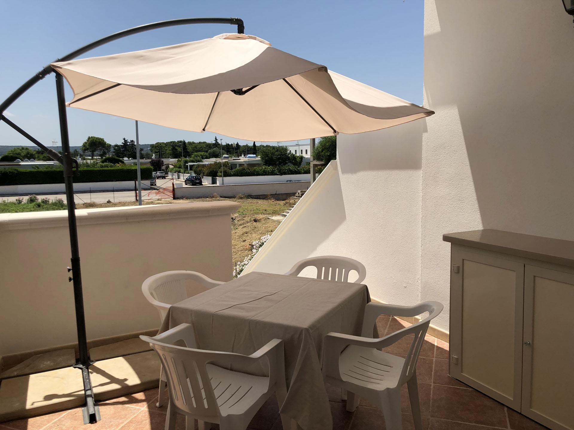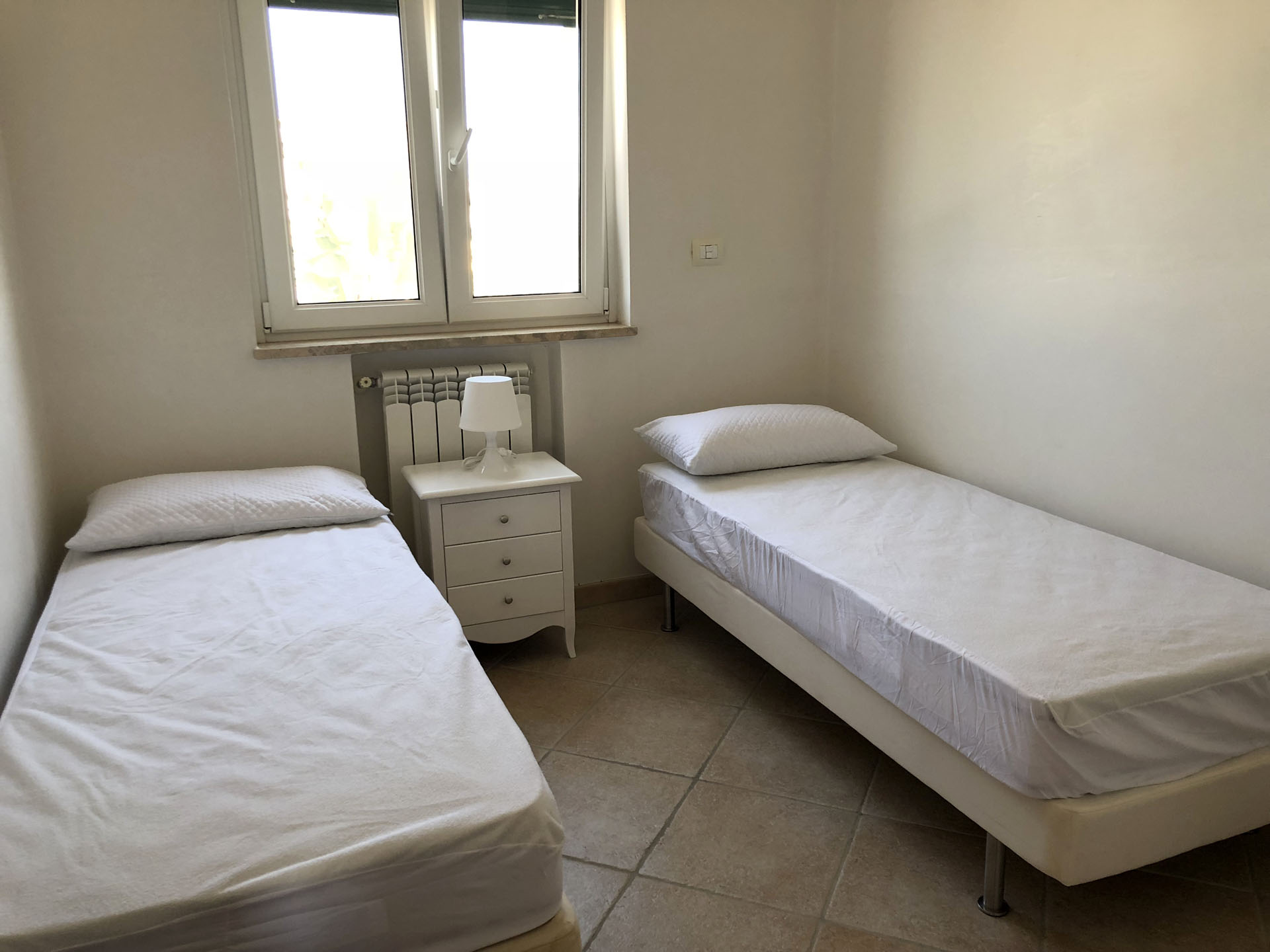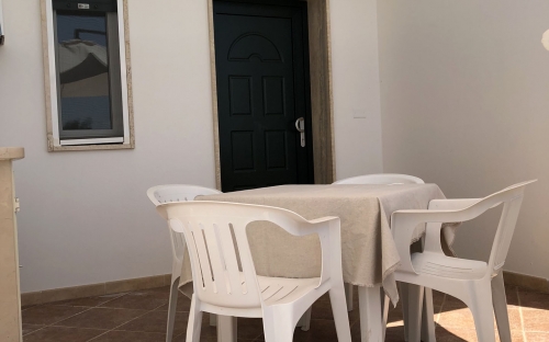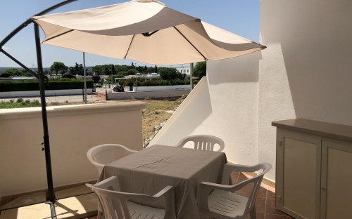 Terraced villas on the coastal strip of Carovigno (BR), in Pantanagianni, a seaside resort between the protected natural Oasis of Torre Guaceto and the "Costa Merlata" of Ostuni. In a private residence, comfortable houses 200 m from the sea - blue flag awarded by FEE (Foundation for Environmental Education). The villas are on the first floor with independent access and consist of three rooms of approx.70 m2 plus utilities. There is a living room with sofa/bed, fitted kitchen, small hall, bathroom with shower, double bedroom, bedroom with two single beds. The villa can accommodate up to a maximum of seven beds. Spacious equipped veranda. Private enclosed access from external ground floor area with parking spaces and shower. Included: split air conditioning in living room, TV and washing machine. Suitability: Babies admitted (cot and high chair included), animals admitted.